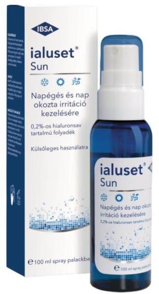Hialuronsav tartalma hidratálja és visszaállítja a száraz és irritált bőr egyensúlyát. Bőrgyógyászati vizsgálatok alátámasztják, hogy a ialuset® Sun jótékony hatással van az igénybe vett és kipirosodott bőrre, nyugtató hatásának köszönhetően csökkenti az égő érzést és azonnal javítja a bőr hidratáltságát. (alkalmazása után 1 óra elteltével 10,8%-kal, 2 óra elteltével 4,9%-kal). Bőrgyógyászatilag tesztelt érzékeny bőrön. *Kellemes illata van. Nem tartalmaz parabént és hajtógázt. Bőrgyógyászatilag tesztelt érzékeny bőrön. * ialuset® Sun felhasználói tájékoztató. Ed. II/01.23 HU Rev. 02 Összetevők A ialuset® Sun spray 0,2% hialuronsavat tartalmaz (nátrium-hialuronát oldat formájában)Víz, poliszorbát 20, fenoxietanol, nátrium-klorid, nátrium-hialuronát, parfüm, arginin, benzoesav, dehidro-ecetsav, etilhexil-glicerin Alkalma zás Pumpás kiszerelése miatt az első használat előtt végezzen próbafújást: a palackot álló helyzetben tartva, nyomja le a szórófejet 3-4-szer egymás után. Permetezze közvetlenül a kívánt területre 15-20 cm-es távolságból, míg az érintett területet teljesen be nem fedi. Rövid időn belül felszívódik a bőrön, de ha a szükséges, finoman oszlassa el, amíg teljesen felszívódik. Használja naponta kétszer vagy igény szerint, korhatár nélkül. Fejbőrön is alkalmazható.